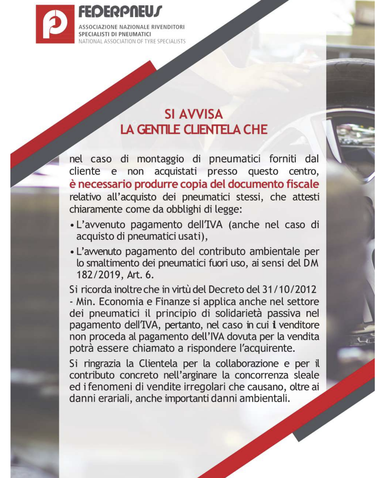 MONTAGGIO PNEUMATICI NUOVI DEL CLIENTE: